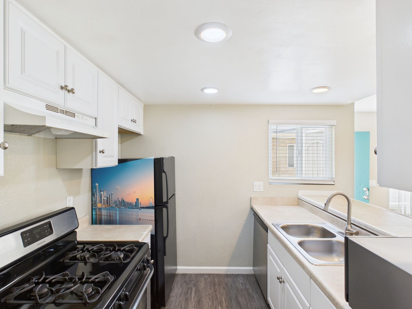Stainless steel appliances, including a gas range and dishwasher