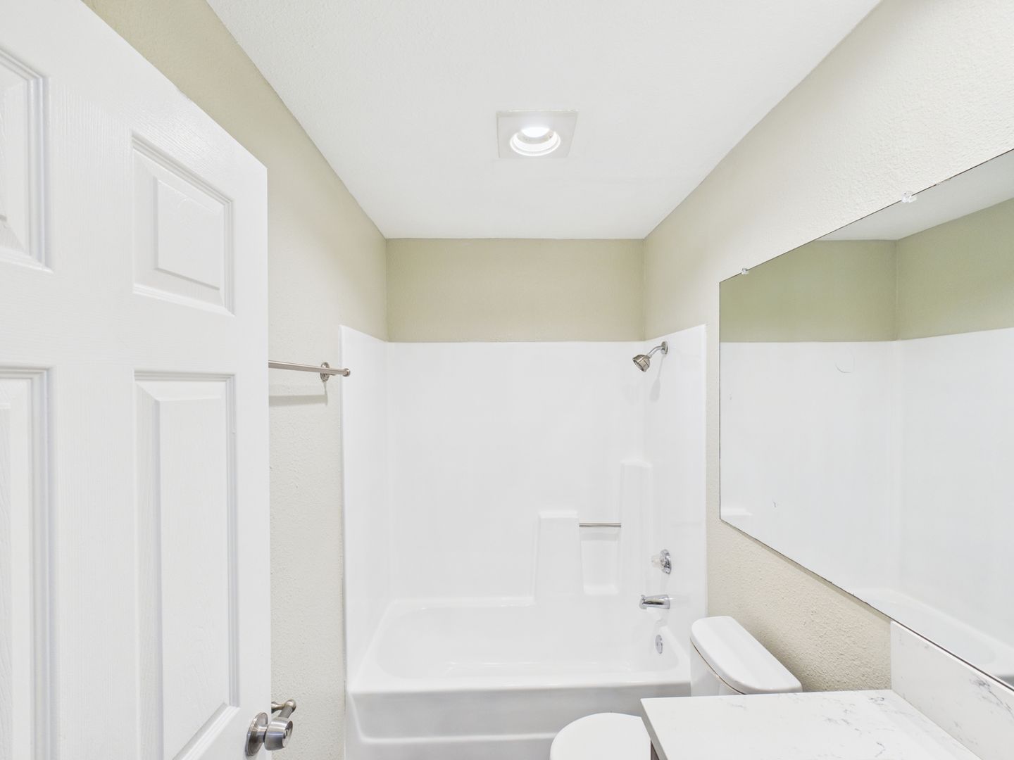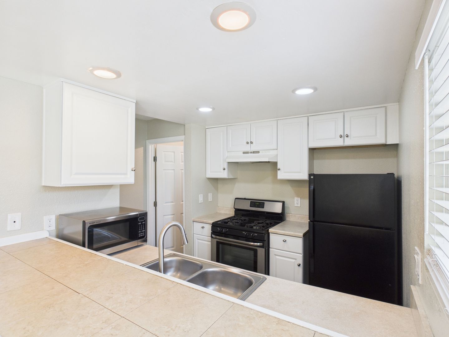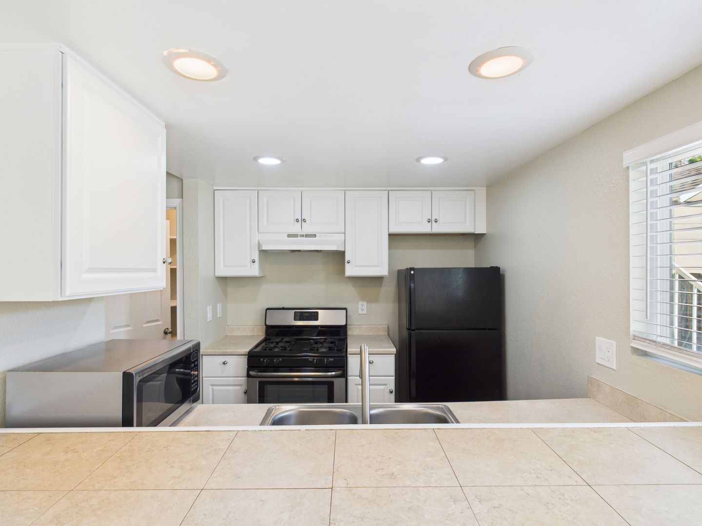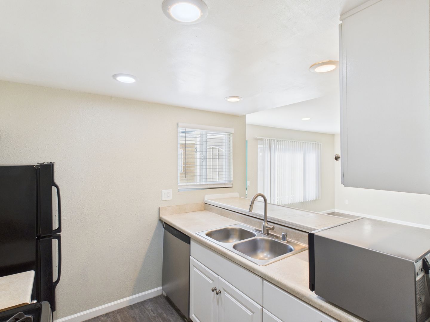 Recessed lighting and large windows that bring in abundant natural light