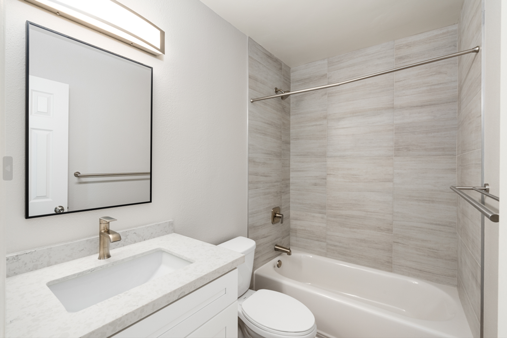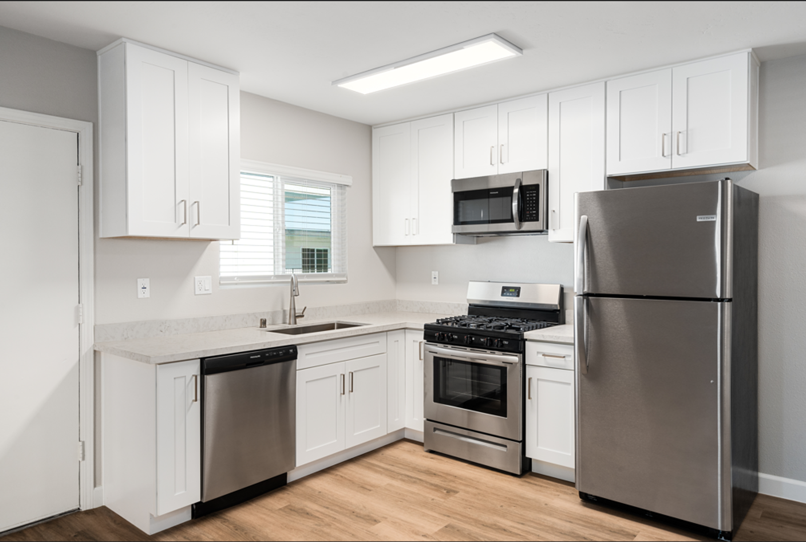 Inside each home, you'll find quartz countertops, white shaker cabinetry, and stainless-steel appliances—including gas ranges, dishwashers, and microwaves. Flooring has been upgraded throughout, and bathrooms feature tile details, modern vanities, and walk-in showers in select units. Some apartments include in-unit laundry, while others have access to convenient onsite laundry.